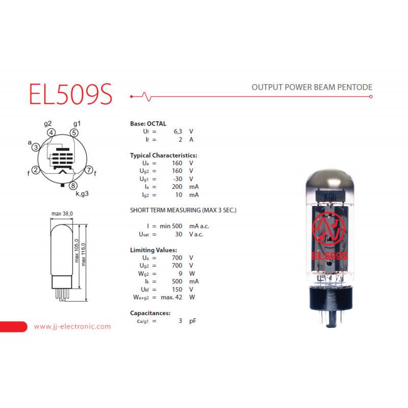 EL509S is a modified version of the original EL509/EL519. Does not have a top plate-cap and has an 8-pin octal base. Can handle 700V and 42W plate dissipation. Popular in OTL applications.