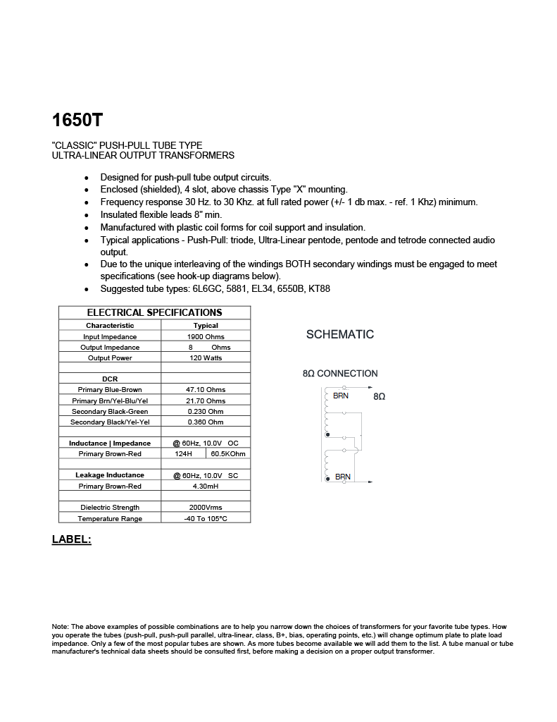 Used with configuration: 4, 6 or 8 tubes 6L6GC, 5881, EL34, 6550B, KT88. Interchangeable with Hammond 1650TA.