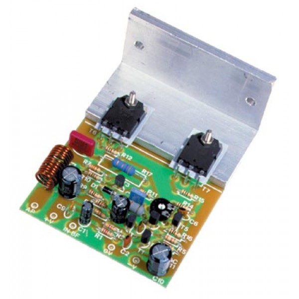 Compatto modulo HI-FI a mosfet in grado di erogare una potenza di 100 watt su 8 ohm e di 150 watt su 4 ohm con una tensione di alimentazione duale di 50 volt per ramo. Il modulo, che utilizza una coppia di mosfet Hitachi, presenta una distorsione inferiore allo 0,1 per cento ed una banda passante compresa tra 5 e 80.000 Hz. Il kit comprende il dissipatore a "L". Per un funzionamento continuo alla massima potenza, il modulo deve essere fissato a un dissipatore a barra adatto a 1 o 2 moduli. Aletta di raffreddamento non inclusa. Immagine inserita al puro scopo illustrativo.