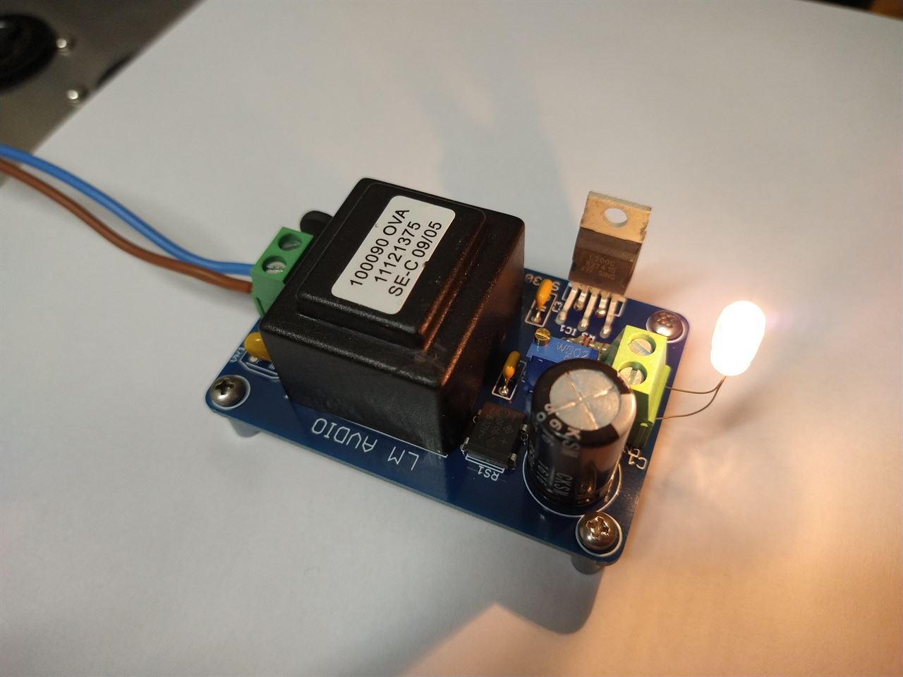 Thank to the double protection on the primary section and the current limiter / protection against shortcircuit you can leave it connected to the line for years without any headcache. Changing the value of only one resistor you can use this kit as a constant current generator from 0 to 200mA. You can see the picture of the test where first we set an output voltage of 12,0V and than connected a 6V 200mA lamp, the circuit limits the output current to 200mA getting down the voltage to 5,96 volt.