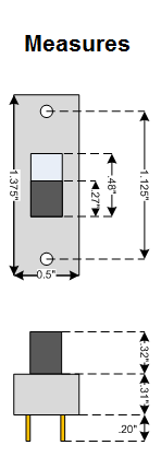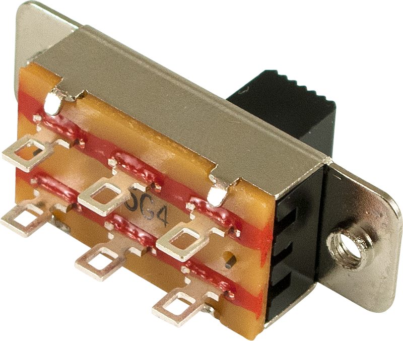 Standard size slide switches, cadmium plated solder connections. 0.3A 125V, DPDT. Good for Fender® bright switch. Can be used as a 'bright' switch on Fenders. Screws not included.