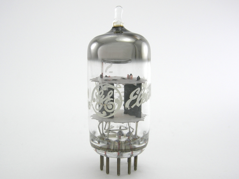 This 1960s military spec GE 6201 / JAN-12AT7WA tube has gray wing plates with copper grid posts, extra support rods, and a disc getter. The green label has the GE logo with "JG-12AT7WA" (partial) and 6201 is engraved in the glass.