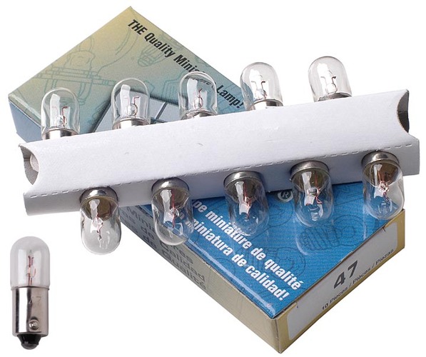 Confezione da 10, prezzo singolo. Lunga durata, ricambio generico per spie, indicatori, etc. Il tipo #47 è il più comune ricambio usato attualmente. Usata da una vastità di amplificatori Fender e molti altri. 6.3 Volt, 0.15 Amp. Base Baionetta. Bulbo: T-3 ¼. Foro pannello ⅝".