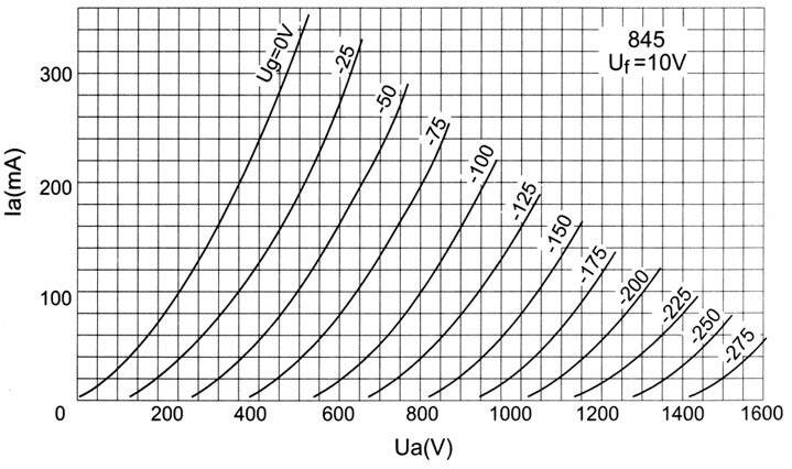 La valvola 845 contiene un triodo a riscaldamento diretto con catodo in torio-tungsteno, e può essere usata nelle classi A, B e C.