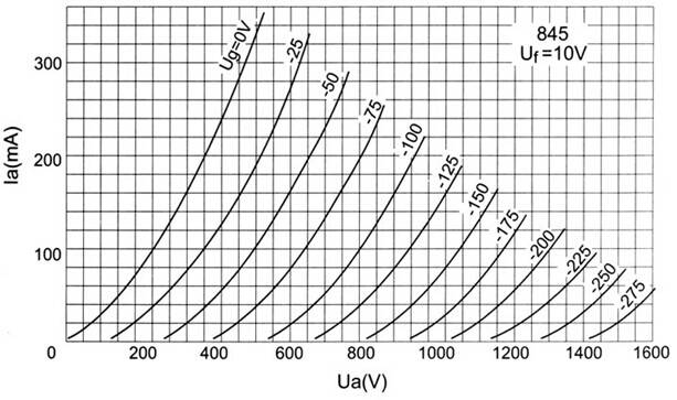 La valvola 845 contiene un triodo a riscaldamento diretto con catodo in torio-tungsteno, e può essere usata nelle classi A, B e C.