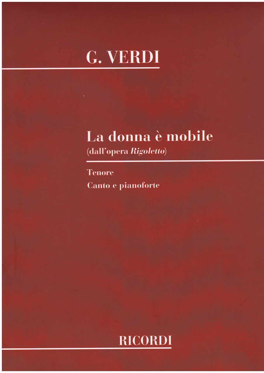 Spartito per canto tenore e pianoforte de La donna è mobile dell'opera Rigoletto di Giuseppe Verdi. Editore Ricordi.